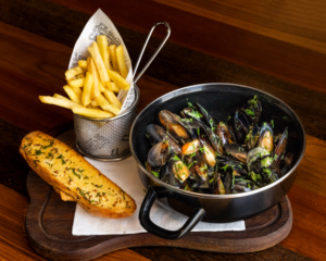 Price: AED 135 for moules mariniere served with fries, garlic bread and a house beverage